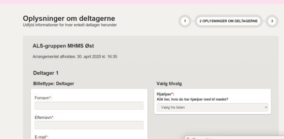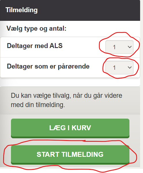 1. Vælg deltagertype (har du ALS eller er du pårørende) og hvor mange du ønsker at tilmelde. Har du hjælper med noteres hjælperen senere i tilmeldingen. Klik på den grønne "start tilmelding".