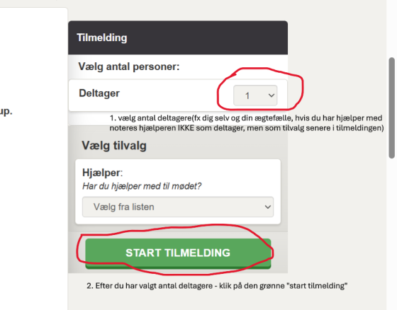 1. Vælg først, hvor mange du vil tilmelde til mødet (fx dig selv og din ægtefælle, hvis du har hjælper med noteres hjælperen IKKE som deltager, men som tilvalg senere i tilmeldingen)